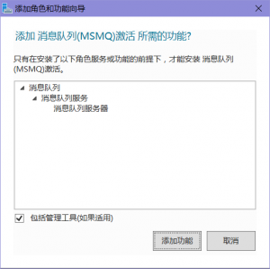 选择”消息队列(MSMQ)激活”->单击”增加功能”