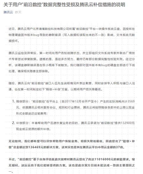 大概内容是,北京清博数控科技有限公司所属“前沿数控”平台一块操作系统云盘,因受所在物理硬盘固件版本bug导致的静默错误(写入数据和读取出来的不一致)影响,文件系统元数据损坏。为此,腾讯云将提供132900元现金或云资源的额外补偿。但是,北京清博数控科技有限公司对结果并不满意,声称所丢失数据价值千万,提出了1101.6万元的补偿额。并质疑腾讯云的的可靠性是否达到了99.9999999%,搭载了云硬盘三副本存储策略,是否真实存在。