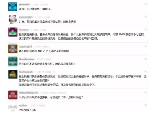 事件发生后,舆论界一方面抨击用户自己没做备份;另一方面对于云的安全性表示担忧,尤其是公有云,还不够靠谱。对于用户自己不做备份的说法,前沿数控表示自己很委屈。一家创业公司,原本就是为节约成本,才选择了云,我总不至于买了一个腾讯云,再买个阿里云来备份。但对于腾讯云来说,云本身就没有100%的可靠性,硬件损毁导致数据丢失,并不是腾讯独有,你支付了1000多块钱,我总不至于付给你上千万的赔偿,这是敲诈!