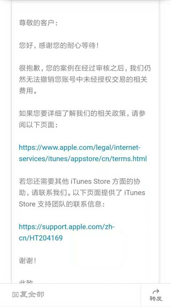 有相关要求退款的用户总结了苹果方的处理过程: “ 索要订单编号或者个人验证,帮助在系统上申请退款(2-3分钟),系统审核不通过-转高级客服(3-5分钟),您别着急我们会尽力帮忙的,申请退款提交系统审核,(2-3分钟)系统审核不通过-非常抱歉,您的心情我们能理解,但是系统审核是我们无法决定的,我们已经是您能联系到的最高权限了。”在于苹果克服沟通过程中,前后需要30多分钟,最终还很可能审核失败。