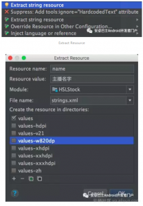 在编写代码的过程中我们应该尽量减少使用硬编码,就是不要再布局中直接使用字符串或者具体的尺寸值或者颜色值,而是应该放在资源文件中.但是对于已经存在的硬编码方式我们又懒得改,或者是嫌麻烦,拿一个字符串来讲,首先我们要在String.xml 文件中编写一个 item 然后写上 id ,写上对应的值,然后再在布局中引用@sring/xxxx……然后心里就默默的告诉自己算了吧,直接写吧.其实不用这么麻烦,只需要选中这个值,按 Opt+Enter弹出菜单选择 Extract String,在弹出的窗口填上id即可,如果该id已经存在会生成失败.