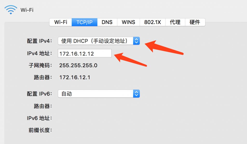 选择 TCP/IP,配置IPv4 中选择手动设定地址。IPv4地址一般默认使用路由器地址172.16.12.X,最后的 X 可以从1-255中填写一个。
