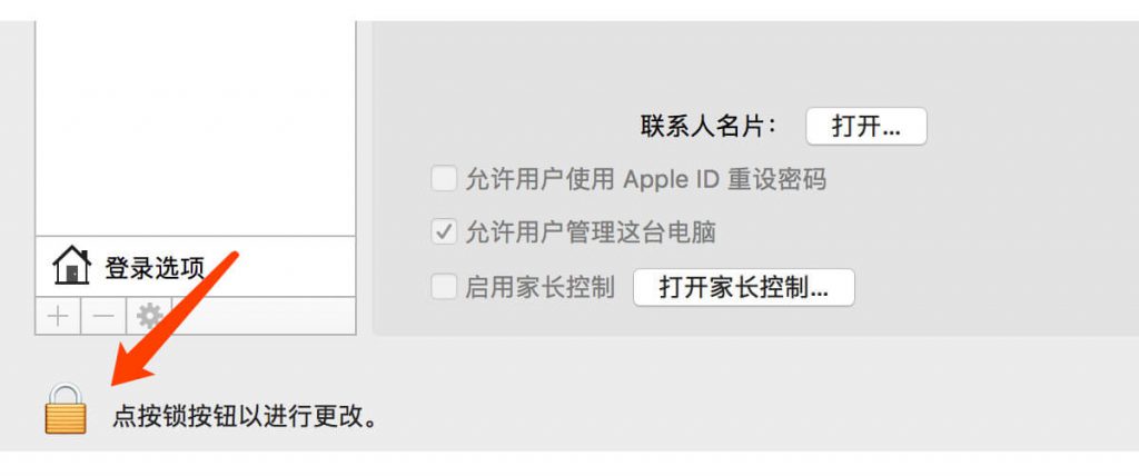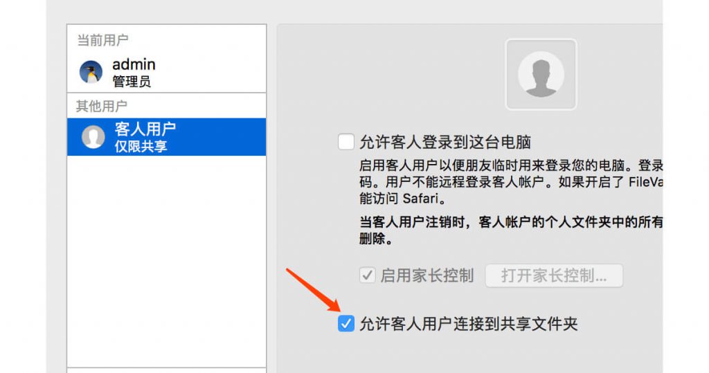 共享文件夹设置好了,要给其他人设置进入权限。打开设置 – 用户与群组 – 客人用户,客人用户选项无法点击的,需要解锁左下方的小锁,输入电脑密码。接下来勾选允许客人用户连接到共享文件夹。设置完毕。