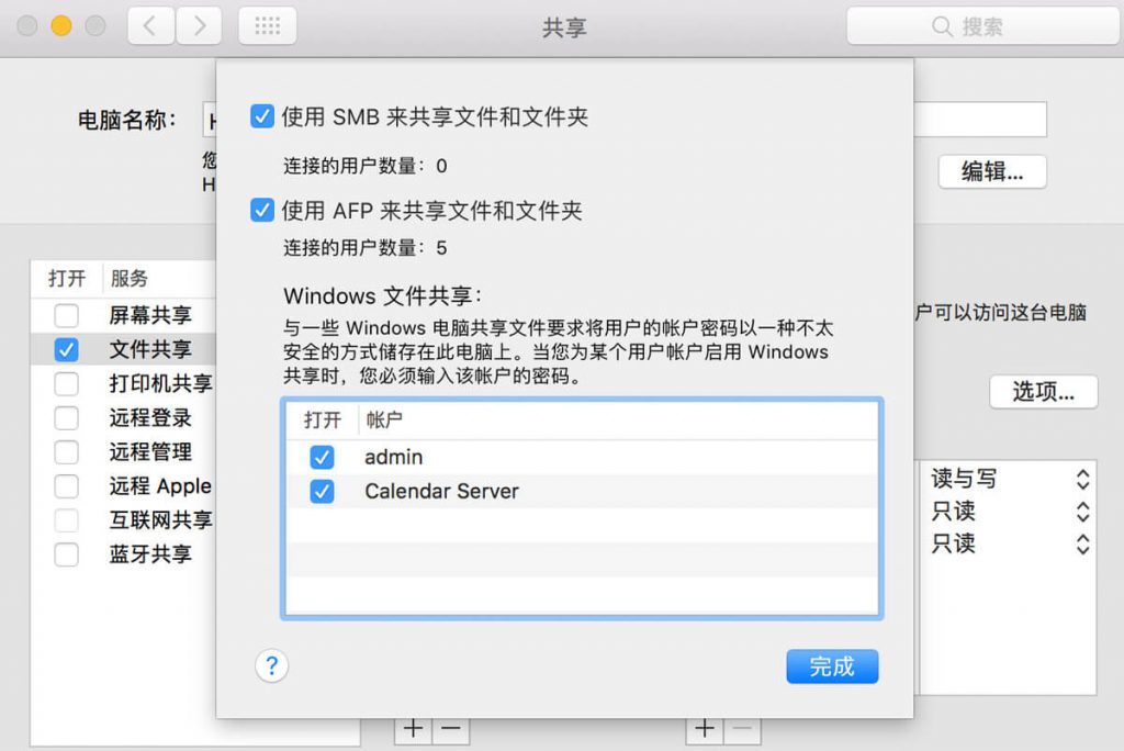 接下来我们要确保文件共享是打开的,勾选上文件共享。然后点击右侧的选项,afp 一般是 Mac电脑使用,smb 一般 win电脑使用,当然 Mac 使用 smb 也是可以的,如果使用 afp 进不到对方电脑就选择 smb 开头。建议 smb 和 afp 共享都勾选。